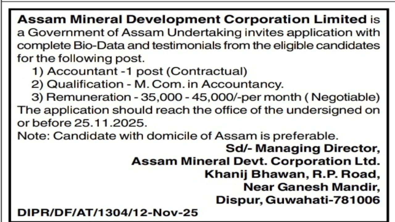 AMDC Recruitment 2025: AMDC Recruitment 2025: Assam Mineral Development Corporation Limited (AMDCL), a Government of Assam Undertaking, has released an official notification inviting applications from eligible candidates for the post of Accountant on a contractual basis. Interested candidates can apply by submitting their bio-data and testimonials before 25 November 2025.
