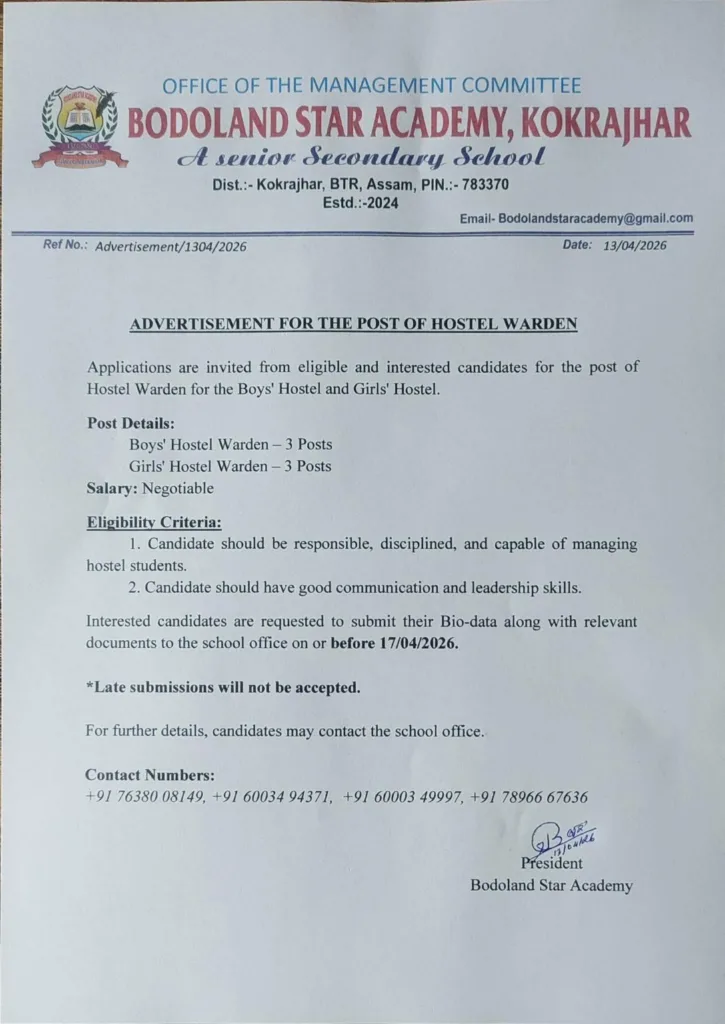 Bodoland Star Academy has released an official notification for the recruitment of Hostel Warden posts for both Boys’ and Girls’ hostels. This is a great opportunity for candidates looking for school jobs in Assam.