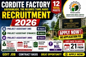Cordite Factory Aruvankadu, Tamil Nadu, a unit of Munitions India Limited, has released an official advertisement for the recruitment of Project Assistant posts on a contract basis. This is a great opportunity for candidates looking for central government factory jobs with good salary and experience.