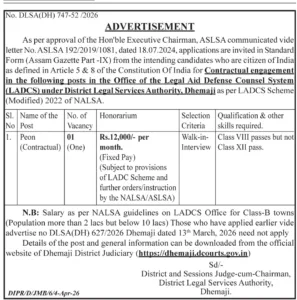The District Legal Services Authority (DLSA), Dhemaji has released an official notification for DLSA Dhemaji Peon Recruitment 2026. This recruitment is conducted for contractual engagement under the Legal Aid Defense Counsel System (LADCS) as per NALSA guidelines.