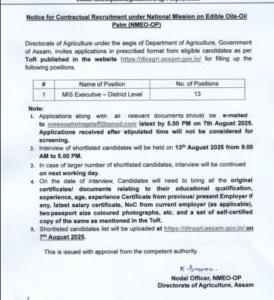 MIS Executive Jobs 2025: The Directorate of Agriculture, Assam, functioning under the Department of Agriculture, Government of Assam, has officially announced a recruitment drive for 13 contractual positions of MIS Executive – District Level under the National Mission on Edible Oils–Oil Palm (NMEO-OP). This is an excellent opportunity for skilled and qualified candidates looking to work in government-supported data and MIS roles, especially within the agricultural sector.